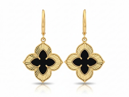 Kolczyki złote wiszące kwiatki z czarnymi onyksami