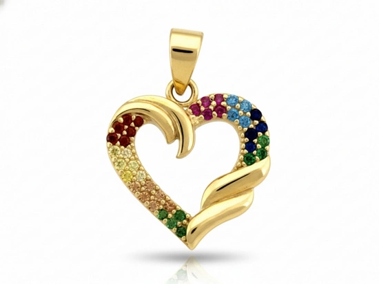 Złote serduszko zawieszka zdobiona kolorowymi cyrkoniami