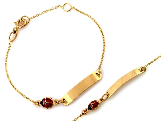 Złota bransoletka z blaszką pod grawer dla dziewczynki z biedronką