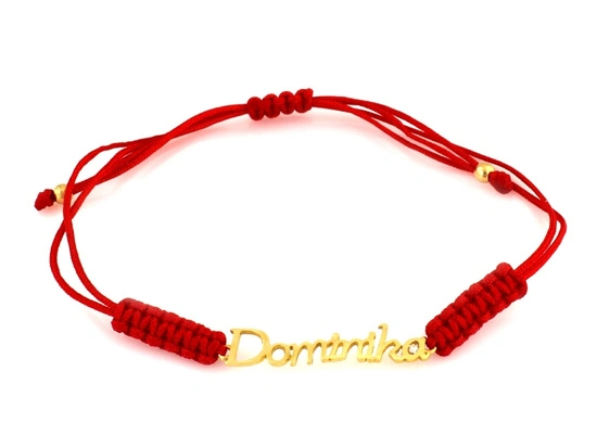 Bransoletka złota imię Dominika na czerwonym sznurku