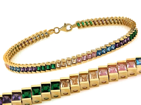 Bransoletka złota prostokątne elementy z kolorowymi cyrkoniami