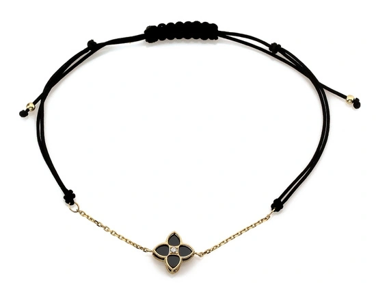 Bransoletka złoty kwiatek z czarnymi kamieniami na czarnym sznurku