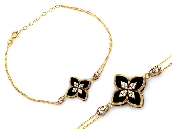 Złota bransoletka podwójny łańcuszek kwiatek z cyrkoniami i onyksami
