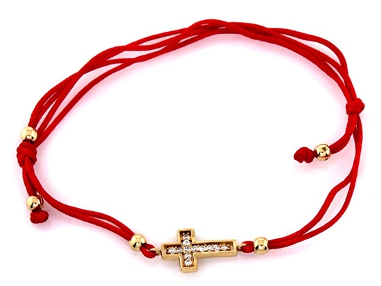 Bransoletka złota krzyżyk z cyrkoniami na czerwonym sznurku