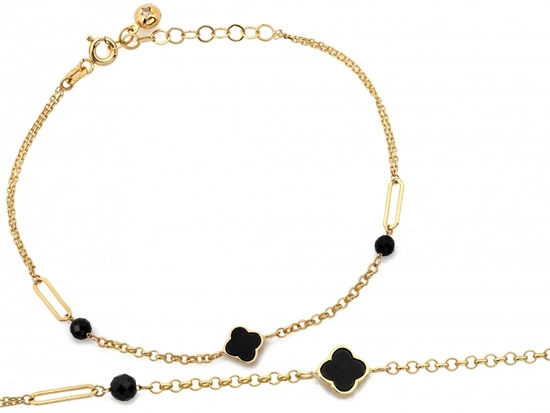 Złota bransoletka modna oryginalna kulki z onyksów czarna koniczynka