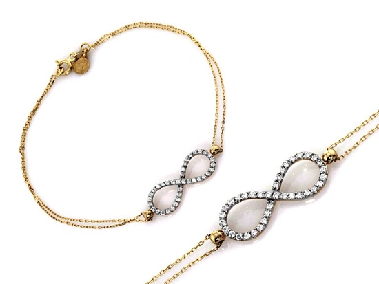 - Szerokość: 8.5mmMateriał: żółte i białe złotoKamień: cyrkonieKamienie: z wieloma kamieniamiMotyw: nieskończonośćWzór: łańcuszkowyPowierzchnia: błyszczącaBudowa: dwurzędowy