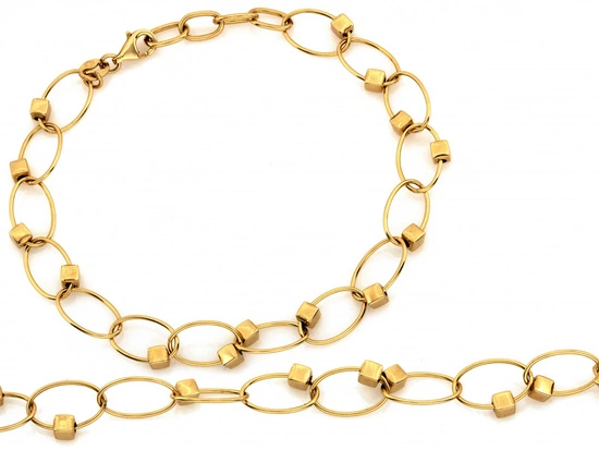 - Szerokość: 7.2mmUwagi dodatkowe: Bransoletka złota ma elegancki i nowoczesny wygląd. Składa się z owalnych dużych ogniw połączonych mniejszymi ogniwami. Dodatkowym elementem dekoracyjnym są małe, geometryczne, sześcienne koraliki rozmieszczone równomierni