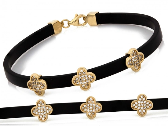Bransoletka złota kwiatki z cyrkoniami na czarnym pasku