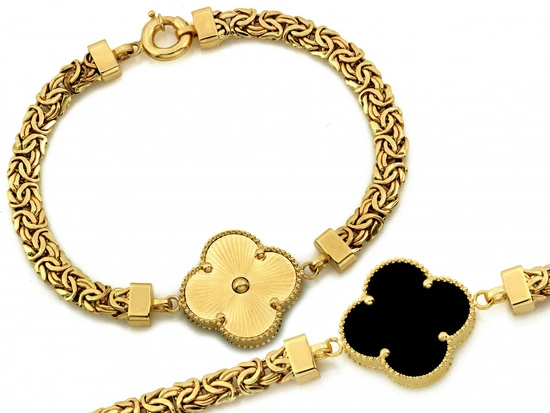 Złota bransoleta gruby splot królewski czarny kwiat z onyksem