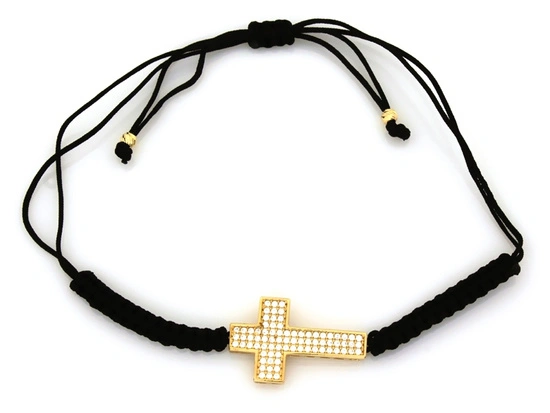 Bransoletka złota krzyżyk wysadzany cyrkoniami na czarnym sznurku