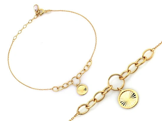 Złota bransoletka wstawka z dużych ogniw z okrągłą zawieszką
