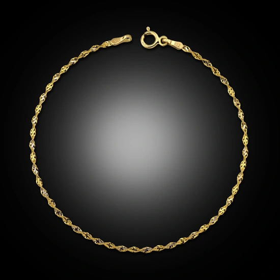 Złota bransoletka o splocie Singapur zachwyca swoją delikatnością i elegancją. Jej skręcony wzór tworzy niezwykłą grę światła, dzięki czemu biżuteria lśni przy każdym ruchu. Wykonana ze złota próby 585, jest połączeniem subtelnego uroku i ponadczasowego stylu.