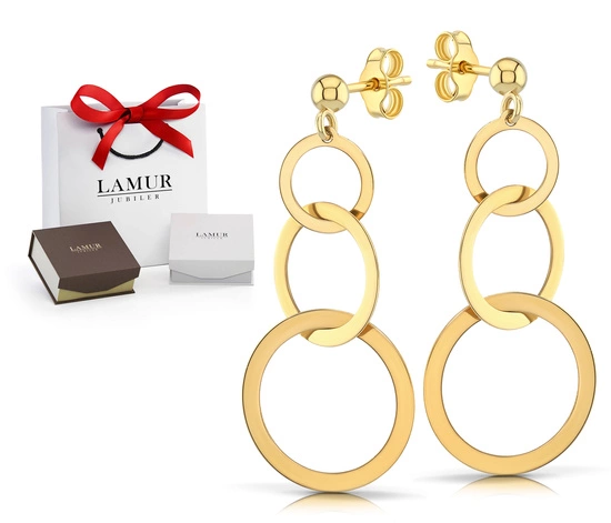 Te efektowne kolczyki to połączenie prostoty i wyrafinowania. Składają się z trzech połączonych ze sobą kół o różnej wielkości, które tworzą harmonijną kompozycję. Lśniące złoto próby 585 nadaje im eleganckiego charakteru, a geometryczny motyw sprawia, że doskonale wpisują się w trendy nowoczesnej biżuterii. Zapięcie na sztyft zapewnia wygodę i stabilność podczas noszenia.
