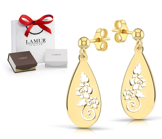 Te wyjątkowe kolczyki w kształcie kropli łączą subtelność złota próby 585 z romantycznym wzorem roślinnym. Ażurowe wycięcia w formie kwiatów i liści nadają im lekkości, a delikatne linie podkreślają ich artystyczny charakter. Dzięki zapięciu na sztyft kolczyki są wygodne w noszeniu i świetnie sprawdzą się zarówno na co dzień, jak i podczas wyjątkowych okazji.