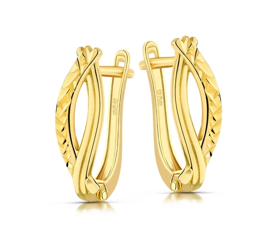 Te złote kolczyki zachwycają harmonijnym połączeniem klasyki i finezyjnego wzornictwa. Delikatnie skrzyżowane linie, z których jedna ozdobiona jest subtelnym diamentowanym wzorem, tworzą elegancką kompozycję pełną blasku i lekkości. Ich unikalna forma dodaje charakteru, a jednocześnie pozostaje niezwykle uniwersalna – idealna zarówno na co dzień, jak i na wyjątkowe okazje.