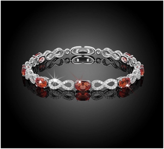 Oferowana Państwu bransoletka została wykonana z najwyższej jakości rodowanego* srebra próby 925, której głównym elementem są naturalne granaty, diamentowe cyrkonie* oraz ponadczasowy motyw nieskończoności. W połączeniu z najwyższą jakością wykonania otrzymujemy biżuterię o wyjątkowych walorach wizualnych i estetycznych.