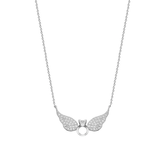 Oferowany Państwu naszyjnik został wykonany z najwyższej jakości rodowanego* srebra próby 925. Niewątpliwie jego największym atutem są diamentowe cyrkonie* w zawieszce oraz fantazyjny motyw uskrzydlonego pierścionka. Kompozycję naszyjnika zamyka pięknie błyszczący i efektowny łańcuszek w splocie ankier. W połączeniu z wysoką jakością wykonania otrzymują Państwo naszyjnik o czarującym i przykuwającym oko wyglądzie.