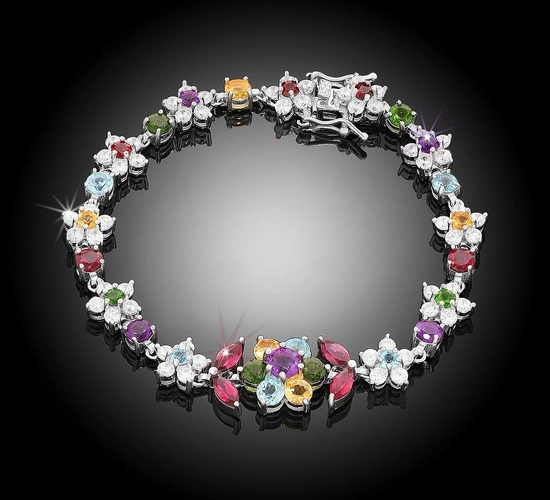 Oferowana Państwu bransoletka została wykonana z najwyższej jakości rodowanego* srebra próby 925. Jej głównym elementem są naturalne ametysty, diopsydy, cytryny, rodolity, topazy oraz diamentowe cyrkonie*. W połączeniu z najwyższą jakością wykonania otrzymują Państwo biżuterię o wyjątkowych walorach wizualnych i estetycznych.