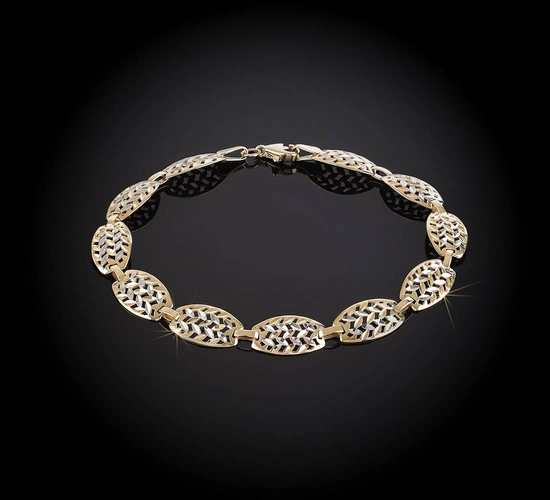 Połączenie elegancji i wyjątkowego rzemiosła jubilerskiego. Ta niezwykła bransoletka została wykonana z wysokiej jakości żółtego i białego złota próby 375, co nadaje jej unikalny charakter i ponadczasowy blask. Każdy element został ręcznie dopracowany i zdobiony przez mistrza jubilerstwa, dzięki czemu bransoletka zachwyca oryginalnym designem oraz precyzją wykonania. Dwukolorowe złoto tworzy subtelny kontrast, który podkreśla piękno detali i sprawia, że biżuteria prezentuje się niezwykle efektownie.