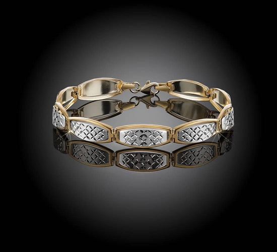 Połączenie elegancji i wyjątkowego rzemiosła jubilerskiego. Ta niezwykła bransoletka została wykonana z wysokiej jakości żółtego i białego złota próby 333, co nadaje jej unikalny charakter i ponadczasowy blask. Każdy element został ręcznie dopracowany i zdobiony przez mistrza jubilerstwa, dzięki czemu bransoletka zachwyca oryginalnym designem oraz precyzją wykonania. Dwukolorowe złoto tworzy subtelny kontrast, który podkreśla piękno detali i sprawia, że biżuteria prezentuje się niezwykle efektownie.