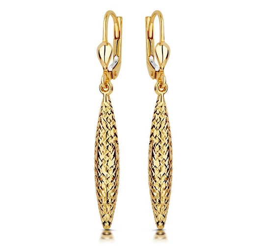 Złote kolczyki próby 375 zachwycają subtelnym połyskiem i eleganckim kształtem, który podkreśla kobiecą delikatność. Ich smukła, wydłużona forma ozdobiona została diamentowanym wykończeniem, które pięknie odbija światło, tworząc efekt pełen blasku i luksusu.