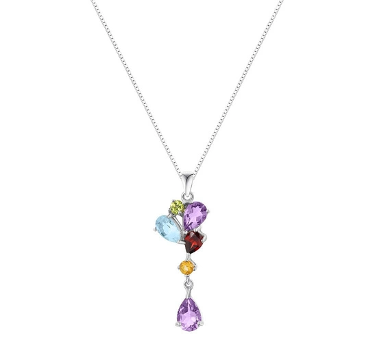 Oferowany Państwu naszyjnik został wykonany z najwyższej jakości rodowanego* srebra próby 925, którego największym atutem jest naturalny ametyst, topaz, granat, oliwin oraz cytryn. Kompozycję naszyjnika zamyka pięknie błyszczący i efektowny łańcuszek w splocie weneckim. W połączeniu z wysoką jakością wykonania otrzymują Państwo naszyjnik o czarującym i przykuwającym oko wyglądzie.