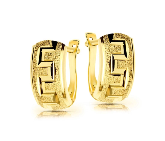 Złote kolczyki próby 585 to wyjątkowa propozycja dla kobiet, które kochają ponadczasowe wzory z nutą oryginalności. Ich szeroka forma została ozdobiona dekoracyjnym motywem inspirowanym greckim wzornictwem, co nadaje im charakteru i elegancji. Połysk szlachetnego złota pięknie współgra z geometrycznym zdobieniem, tworząc efektowną i niepowtarzalną kompozycję.