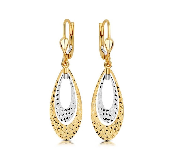 Złote kolczyki próby 375 to harmonijne połączenie żółtego i białego złota, które tworzy wyrafinowany, dwukolorowy efekt. Ich wydłużony, ażurowy kształt delikatnie wysmukla szyję, a diamentowane wykończenie pięknie odbija światło, nadając całości wyjątkowego połysku.
