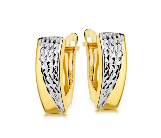 Te eleganckie kolczyki ze złota próby 375 to połączenie klasyki i subtelnej nowoczesności. Ich powierzchnia zdobiona diamentowanym, dwukolorowym wzorem w odcieniach żółtego i białego złota pięknie odbija światło, tworząc efekt luksusowego połysku.