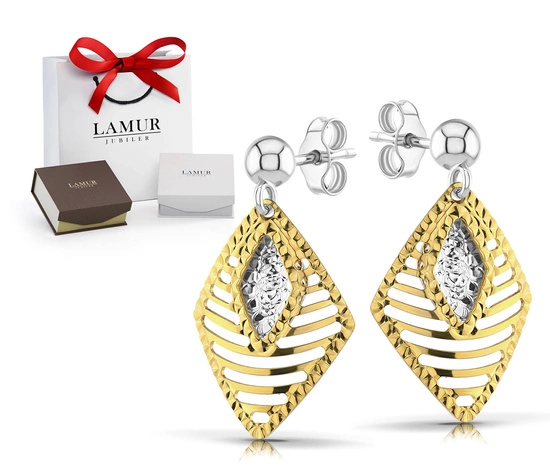 Te wyjątkowe kolczyki zostały wykonane z żółtego złota próby 585 i ozdobione centralnym elementem w białym odcieniu, który pięknie kontrastuje z ciepłym blaskiem złota. Ich forma w kształcie rombu z ażurowym wzorem nadaje całości lekkości, a diamentowana powierzchnia dodaje biżuterii niepowtarzalnej faktury i charakteru. Zapięcie na sztyft sprawia, że są wygodne i stabilne w noszeniu.