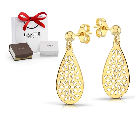 Kolczyki wykonane z żółtego złota próby 585 zachwycają delikatnym wzorem inspirowanym naturą. Smukła forma kropli została ozdobiona ażurowym motywem kwiatowym, który nadaje im lekkości i niezwykłej finezji. Zapięcie na sztyft zapewnia komfort noszenia, a całość prezentuje się elegancko i zmysłowo.