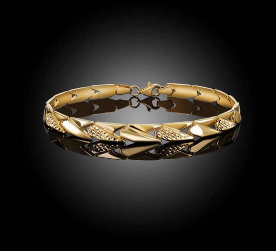 Klasyczna elegancja w nowoczesnym wydaniu. Ta bransoletka ze złota próby 375 została stworzona z geometrycznych, elementowych ogniw, które pięknie odbijają światło, tworząc wyjątkowy, błyszczący efekt. Należąca do kolekcji Stampato, zachwyca precyzją wykonania i ponadczasowym stylem. Każdy egzemplarz został wykonany ręcznie przez mistrza jubilerstwa, dzięki czemu bransoletka zyskuje unikalny charakter i staje się prawdziwym dziełem jubilerskiej sztuki. To ozdoba, która świetnie sprawdzi się zarówno w codziennych stylizacjach, jak i podczas wyjątkowych okazji. Jej elegancki blask i klasyczny design czynią ją także doskonałym wyborem na prezent.