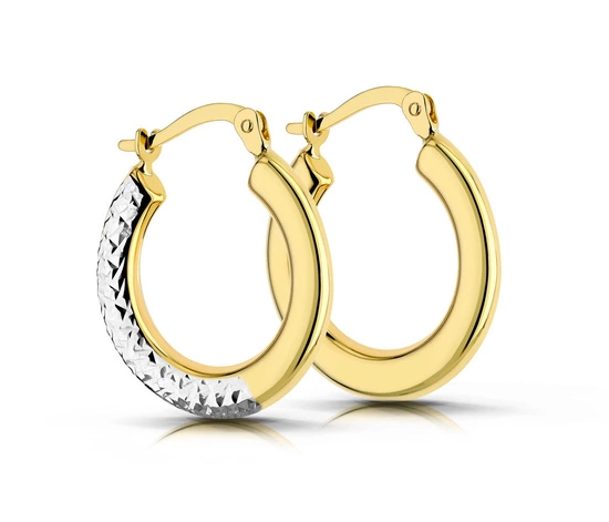 Te złote kolczyki koła próby 333 zachwycają połączeniem klasycznej formy i nowoczesnego blasku. Delikatne diamentowane wykończenie nadaje im wyjątkowy połysk, który pięknie odbija światło przy każdym ruchu.
