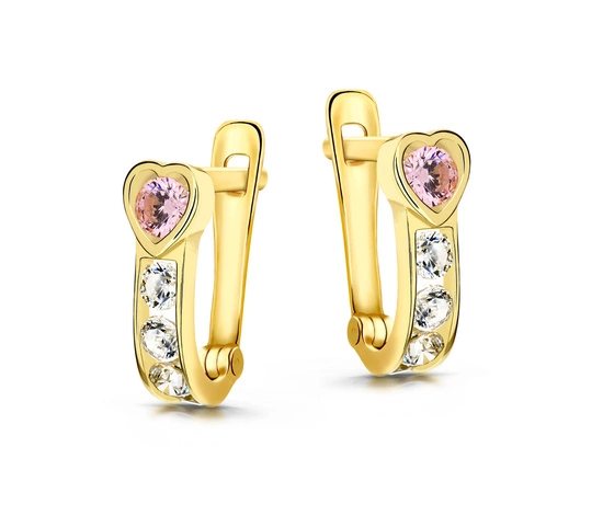Te urocze złote kolczyki próby 333 to idealny wybór dla małej księżniczki. Delikatny kształt serduszka z różową cyrkonią i błyszczące, białe kamyczki tworzą wyjątkowo dziewczęcy, subtelny efekt.