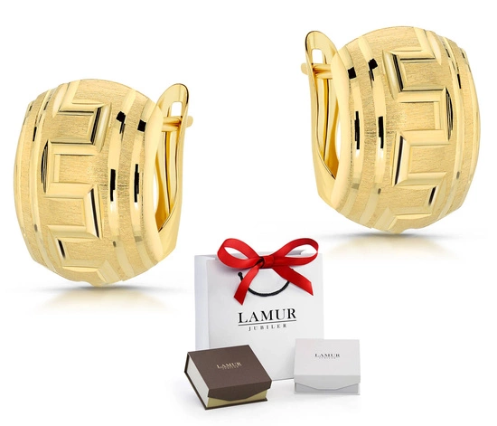 Złote kolczyki próby 585 to wyjątkowa propozycja dla kobiet, które kochają ponadczasowe wzory z nutą oryginalności. Ich szeroka forma została ozdobiona dekoracyjnym motywem inspirowanym greckim wzornictwem, co nadaje im charakteru i elegancji. Połysk szlachetnego złota pięknie współgra z geometrycznym zdobieniem, tworząc efektowną i niepowtarzalną kompozycję.