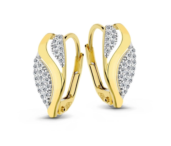 Te wyjątkowe kolczyki to połączenie ponadczasowego piękna złota i olśniewającego blasku cyrkonii. Subtelne linie w żółtym złocie oplatają misternie wysadzane kamienie, tworząc harmonijną kompozycję, która zachwyca swoją lekkością i elegancją. Efektowne zdobienie nadaje biżuterii luksusowego charakteru, podkreślając jej wyjątkowy styl.