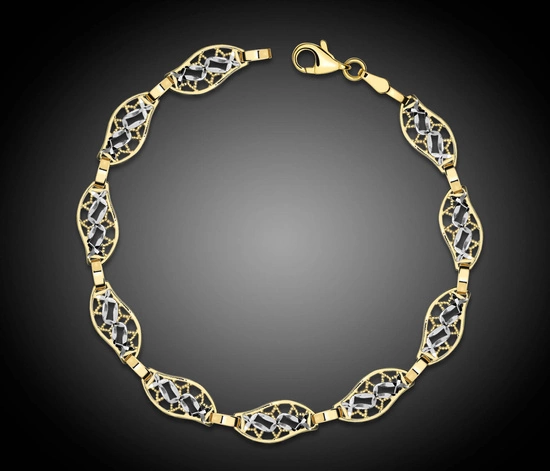 Połączenie elegancji i wyjątkowego rzemiosła jubilerskiego. Ta niezwykła bransoletka została wykonana z wysokiej jakości żółtego i białego złota próby 375, co nadaje jej unikalny charakter i ponadczasowy blask. Każdy element został ręcznie dopracowany i zdobiony przez mistrza jubilerstwa, dzięki czemu bransoletka zachwyca oryginalnym designem oraz precyzją wykonania. Dwukolorowe złoto tworzy subtelny kontrast, który podkreśla piękno detali i sprawia, że biżuteria prezentuje się niezwykle efektownie.