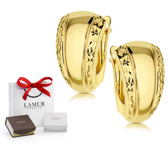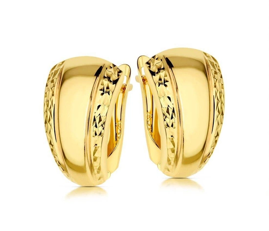 Złote kolczyki próby 375 o subtelnie diamentowanej powierzchni to elegancka propozycja dla kobiet ceniących wyrafinowany styl. Ich delikatnie wypukła forma pięknie odbija światło, tworząc efekt subtelnego połysku i głębi. Połączenie klasycznego kształtu z misternym wykończeniem sprawia, że kolczyki doskonale podkreślają urodę i dodają blasku każdej stylizacji.