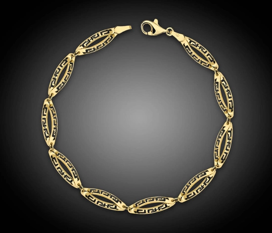 Bajecznie piękna i pełna klasy, stworzona ręką mistrza jubilerstwa z najwyższej jakości złota próby 375. Bransoletka zachwyca eleganckim wzornictwem inspirowanym motywem greckim. Ręcznie wykonane owalne ogniwa tworzą harmonijną i wyrazistą kompozycję, która pięknie układa się na nadgarstku i podkreśla indywidualny styl. To biżuteria dla kobiet, które cenią połączenie tradycji z nowoczesnością. Subtelne nawiązania do kultury greckiej nadają jej wyjątkowego charakteru, a ręczne wykonanie gwarantuje unikatowość każdego egzemplarza.