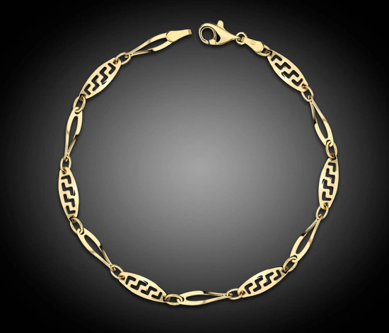 Bajecznie piękna i pełna klasy, stworzona ręką mistrza jubilerstwa z najwyższej jakości złota próby 375. Bransoletka zachwyca eleganckim wzornictwem inspirowanym motywem greckim. Ręcznie wykonane owalne ogniwa tworzą harmonijną i wyrazistą kompozycję, która pięknie układa się na nadgarstku i podkreśla indywidualny styl. To biżuteria dla kobiet, które cenią połączenie tradycji z nowoczesnością. Subtelne nawiązania do kultury greckiej nadają jej wyjątkowego charakteru, a ręczne wykonanie gwarantuje unikatowość każdego egzemplarza.