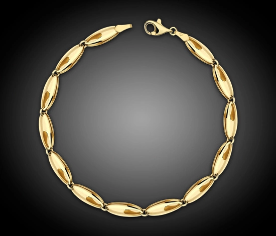 Ta złota bransoletka wykonana z wysokiej jakości złota próby 375 zachwyca klasycznym wzornictwem i pięknym, błyszczącym wykończeniem. Zbudowana z elementowych, owalnych ogniw, prezentuje się wyjątkowo efektownie, a jednocześnie pozostaje uniwersalnym dodatkiem, który pasuje do każdej stylizacji. Każdy egzemplarz został wykonany ręcznie przez mistrza jubilerstwa, co gwarantuje najwyższą jakość oraz unikatowy charakter biżuterii. To ozdoba idealna zarówno do codziennego noszenia, jak i na specjalne okazje.