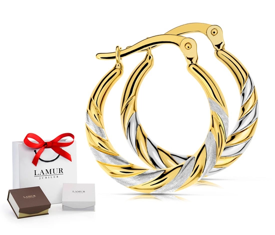 Kolczyki o eleganckim, skręconym wzorze to połączenie żółtego i białego złota próby 375, które tworzy subtelny kontrast i wyjątkowy efekt świetlny. Ich nowoczesna forma inspirowana klasycznym kształtem kółek sprawia, że pasują zarówno do codziennych, jak i wieczorowych stylizacji.