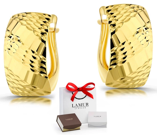 Ze złote kolczyki próby 375 to wyjątkowe połączenie klasyki i nowoczesnego blasku. Ich szeroka, delikatnie zaokrąglona forma pięknie odbija światło dzięki diamentowanemu wykończeniu, nadając biżuterii luksusowy charakter i elegancki połysk.