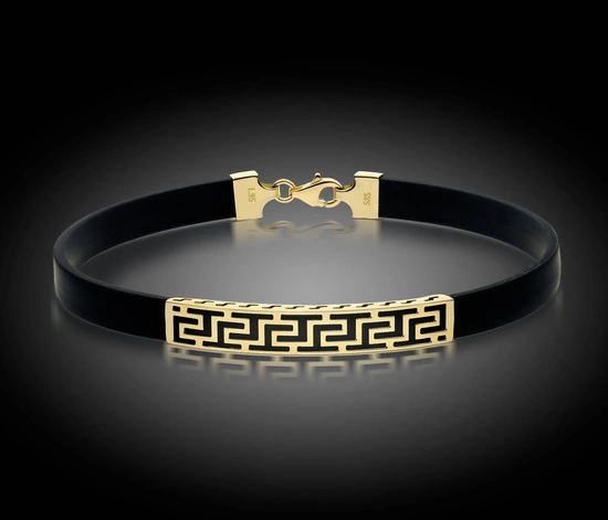 Elegancka i pełna charakteru bransoletka, wykonana z najwyższej jakości złota próby 585 w połączeniu z czarnym kauczukiem. Jej centralnym punktem jest złota ozdoba z geometrycznym motywem greckim, który od wieków symbolizuje harmonię i ponadczasowe piękno. Kontrast złota i czerni sprawia, że bransoletka prezentuje się nowocześnie i stylowo, przyciągając spojrzenia i podkreślając indywidualny charakter właściciela.