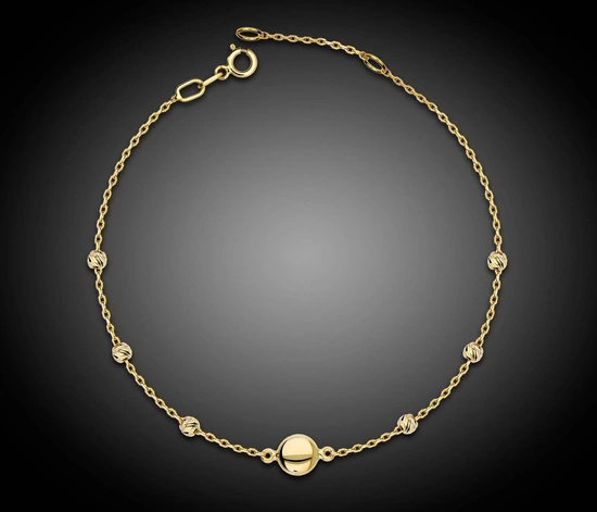 Delikatna, a zarazem wyjątkowa – ta złota bransoletka została stworzona dla kobiet, które cenią klasyczne piękno połączone z nowoczesnym stylem. Jej lekki łańcuszek ozdobiony jest drobnymi kuleczkami, które nadają całości subtelnego charakteru i pięknie połyskują przy każdym ruchu. Centralnie umieszczona większa kulka stanowi elegancki akcent, dzięki któremu biżuteria staje się jeszcze bardziej wyjątkowa.
