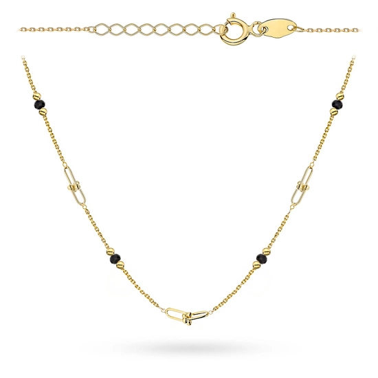 Ten delikatny naszyjnik ze złota próby 585 to idealne połączenie klasy i nowoczesnego minimalizmu. Ozdobiony czarnymi koralikami oraz dekoracyjnymi elementami w kształcie ogniw, tworzy unikatową kompozycję, która przyciąga spojrzenia subtelnym blaskiem. Jego lekka forma sprawia, że doskonale prezentuje się zarówno solo, jak i w zestawieniu z innymi naszyjnikami.