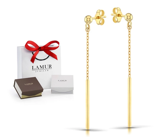 Złote kolczyki wiszące o subtelnym, geometrycznym charakterze to propozycja dla kobiet ceniących wyrafinowaną prostotę. Delikatny łańcuszek zakończony smukłym, podłużnym elementem sprawia, że biżuteria zachwyca lekkością i elegancją, doskonale podkreślając smukłość szyi. Dzięki klasycznym sztyftom kolczyki są wygodne i stabilne w noszeniu.