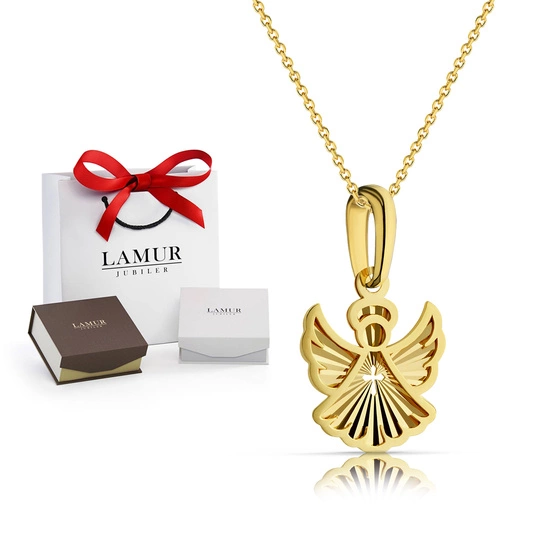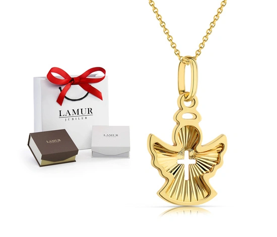 Złoty naszyjnik próby 585 z subtelną zawieszką w kształcie anioła to wyjątkowa biżuteria o głębokiej symbolice. Anioł z rozpostartymi skrzydłami i delikatnym wycięciem w kształcie krzyża jest symbolem duchowej ochrony, czystości i nadziei. Lśniące złoto pięknie odbija światło, podkreślając precyzję i kunszt wykonania każdego detalu.