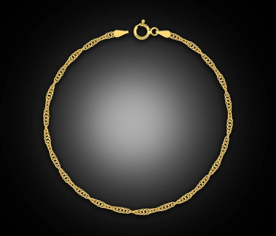 Złota bransoletka o splocie Singapur zachwyca swoją delikatnością i elegancją. Jej skręcony wzór tworzy niezwykłą grę światła, dzięki czemu biżuteria lśni przy każdym ruchu. Wykonana ze złota próby 585, jest połączeniem subtelnego uroku i ponadczasowego stylu.