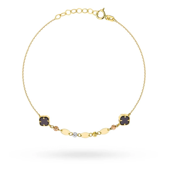Elegancka i subtelna złota bransoletka wykonana z najwyższej jakości złota próby 585, której delikatny łańcuszek zdobią ażurowe koniczynki oraz błyszczące kuleczki w trzech odcieniach złota: żółtym, różowym i białym. Symbol koniczynki od wieków uważany jest za talizman szczęścia, co nadaje bransoletce wyjątkowego znaczenia.